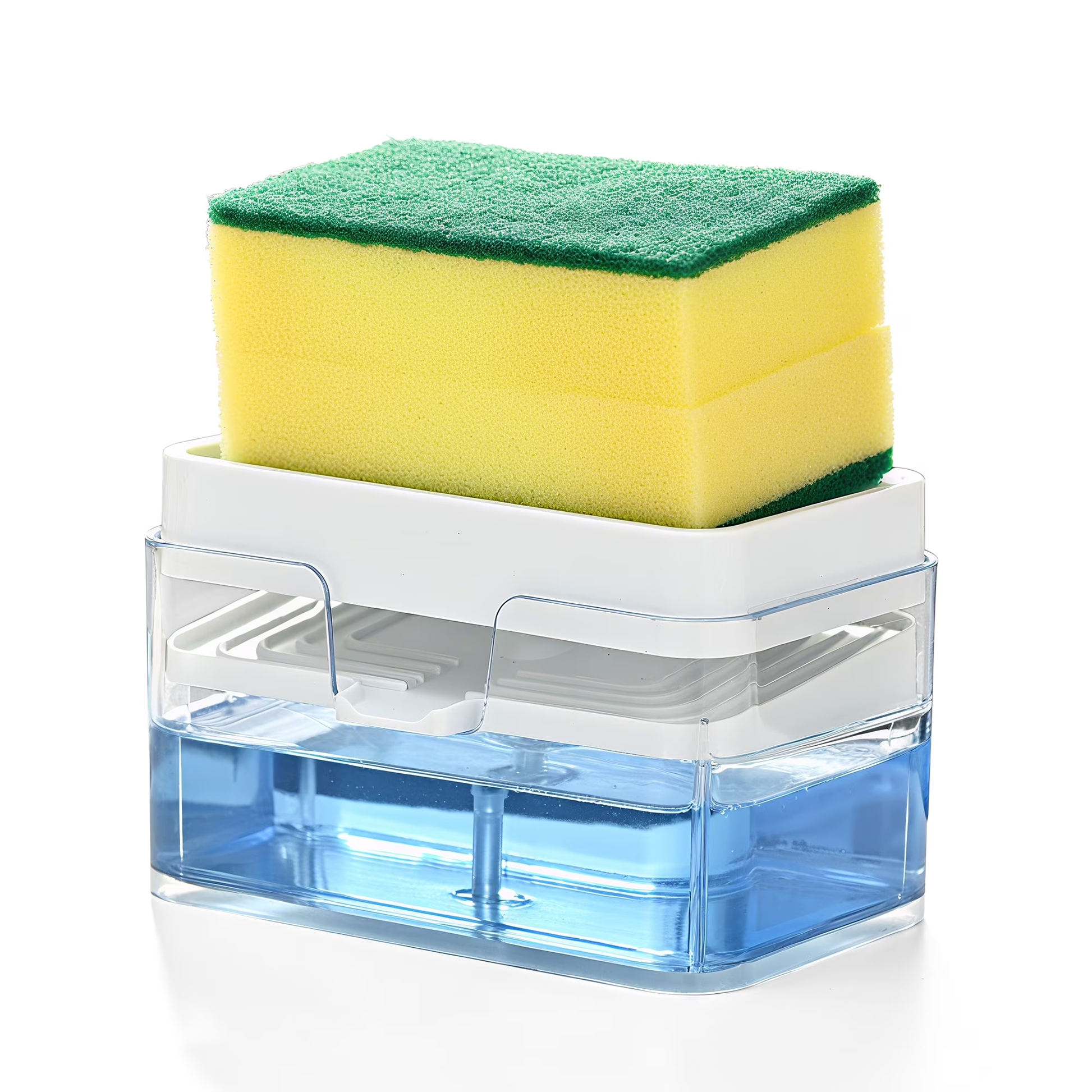 YUOFD Kitchen Soap Dispenser with Sponge Holder, Dishwashing Soap Pump Dispenser with 2 Sponges, Automatic Water Filtration, White